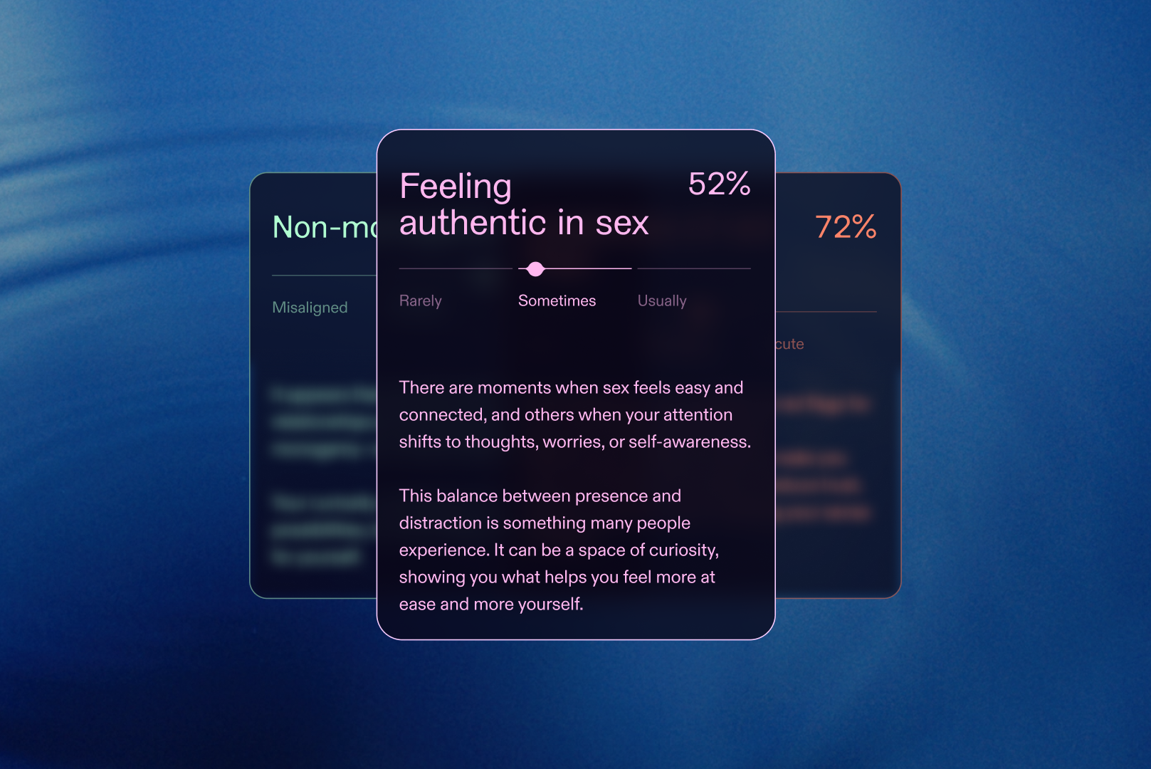 Natalie, Senior Content Designer: “To design Reflections was to design for multiplicity. For the monogamous and the poly, the straight and the queer, the curious and the questioning. For those who have never thought about who they are, and those who have spent years naming it. Inclusivity here isn’t a checklist—it’s an attitude of spaciousness. We write so that everyone might recognize themselves and be expanded by what they read. Every prompt and scale is designed to build safety, agency, and consent. People are not categorized, only mirrored.”