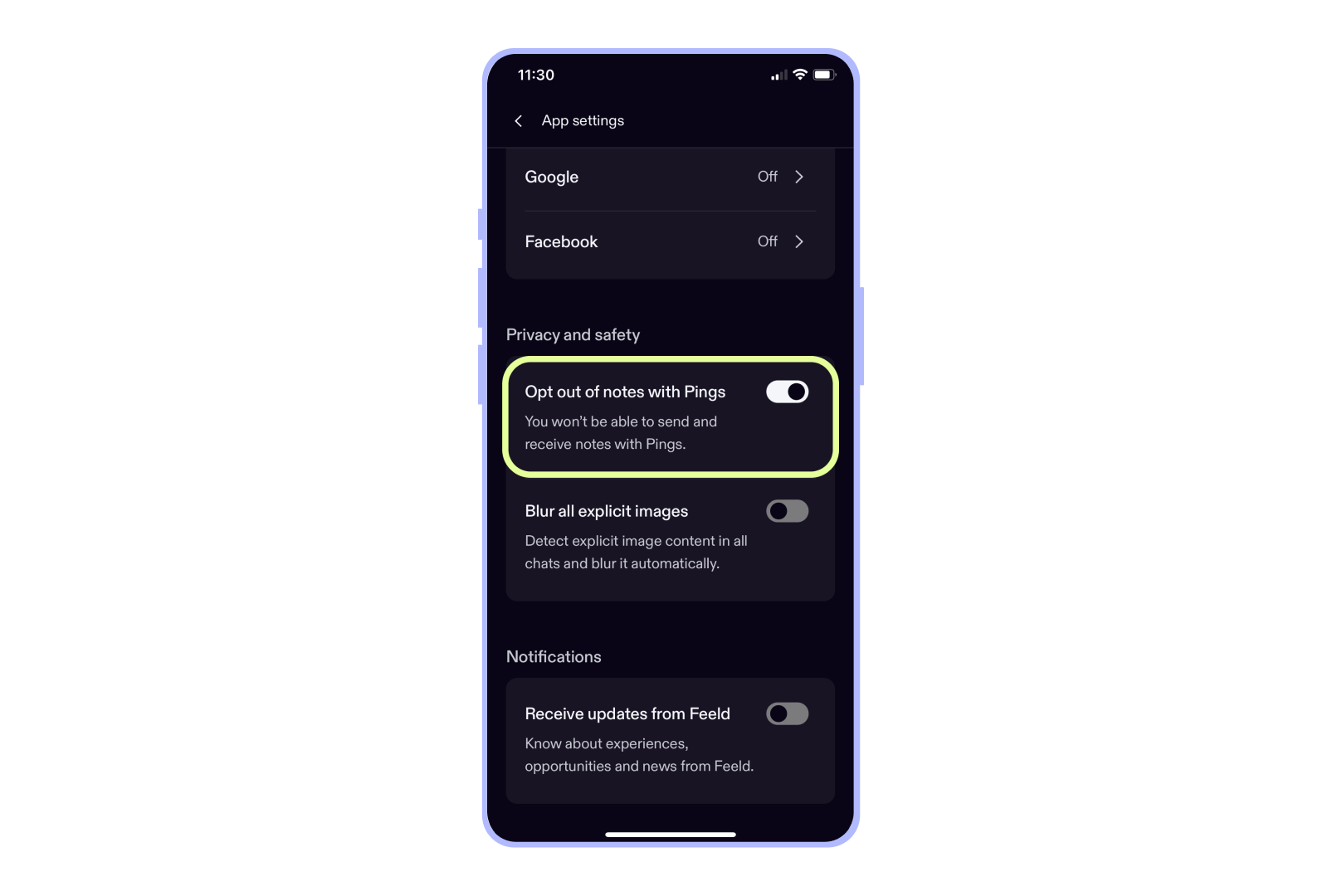 Go to “App settings.” Under “Privacy and safety” you’ll see an option to “Opt out of notes with Pings,” where you can turn the toggle on. Any Ping note received before opting out will still be attached to the existing Pings.
