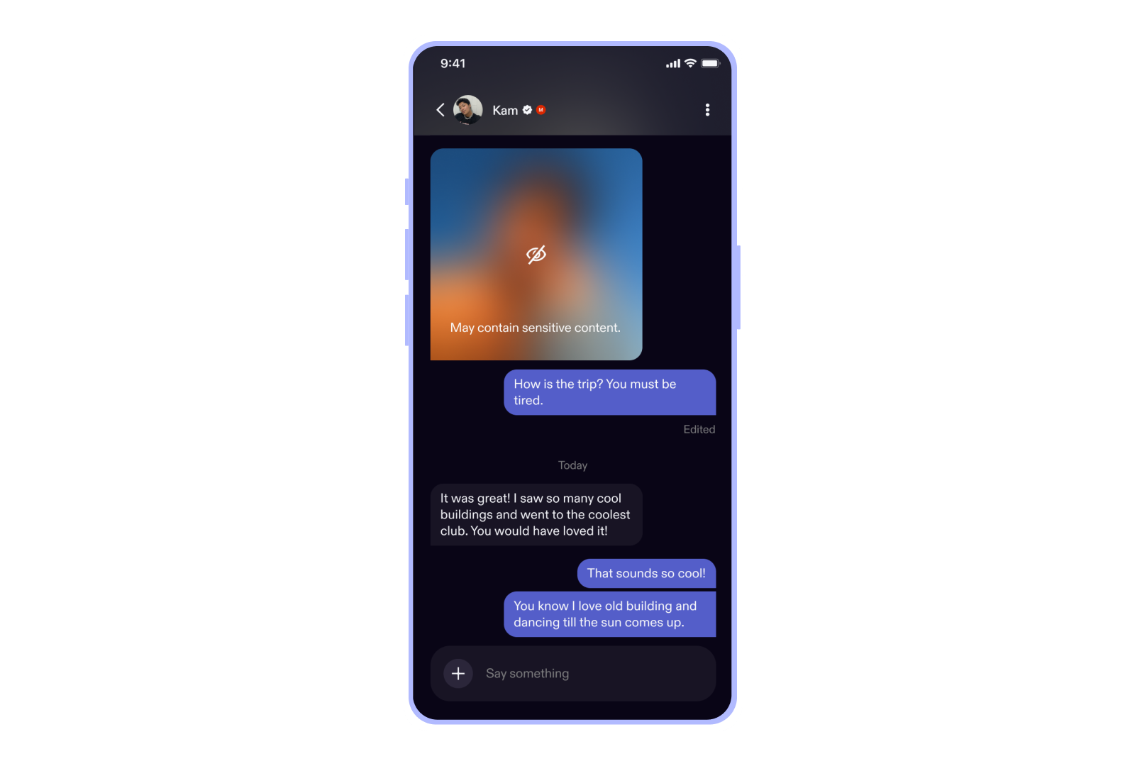Feeld’s nudity detection allows you to manage how images containing nudity show up in your chats. When enabled, images that feature full or partial nudity—or sexual content—will be blurred. This means you can comfortably and confidently explore chats with more control over what you see, creating a consensual environment for everyone.