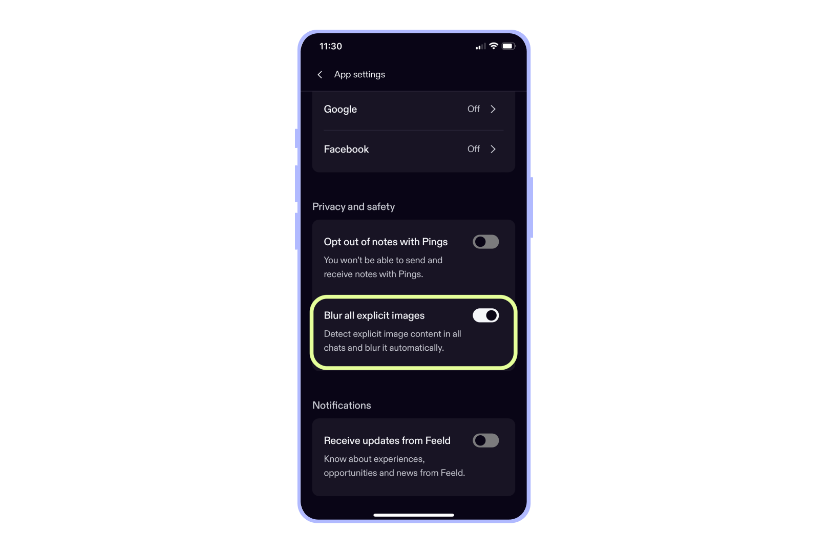 - For all chats, go to “App settings.” Under “privacy and safety,” you’ll see an option to “Blur all explicit images,” where you can turn the toggle on.