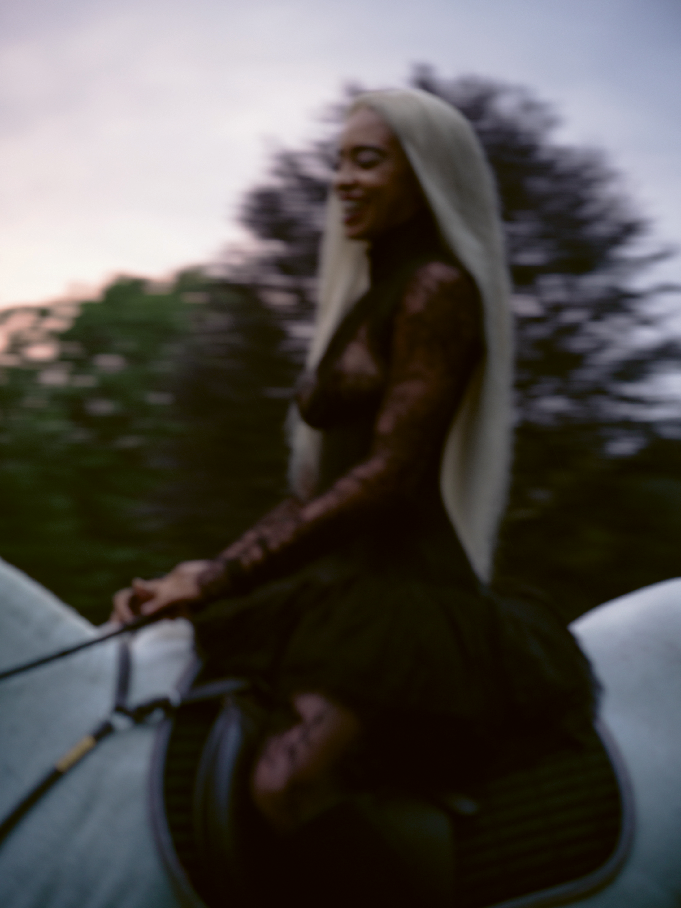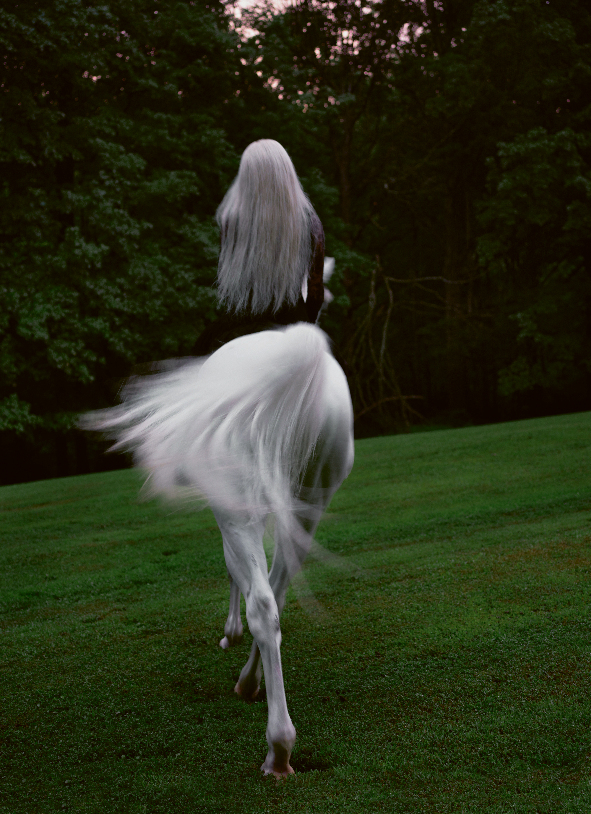 Lu had met Harry through their friendship with the photographer Nan Goldin, who first shot Lu for a Bottega zine in 2021, and more recently, for this story. “I’m not a traditional model and her awareness of the fact that I’m an artist made it so that we both were able to just let loose and have fun in an honest way,” they recall. Recently, Lu was in upstate New York, an area they describe as being “surrounded by horse rehabilitation farms,” and happened to be texting Goldin. “Nan and I were having a conversation while I was in a really low place, emotionally and mentally,” they recall. “The desire to be around animals felt extremely visceral while navigating those emotions. Nan suggested we shoot with horses, and it felt potent. What I love about Nan’s work is that nothing is forced. It is what it is. Honest.”