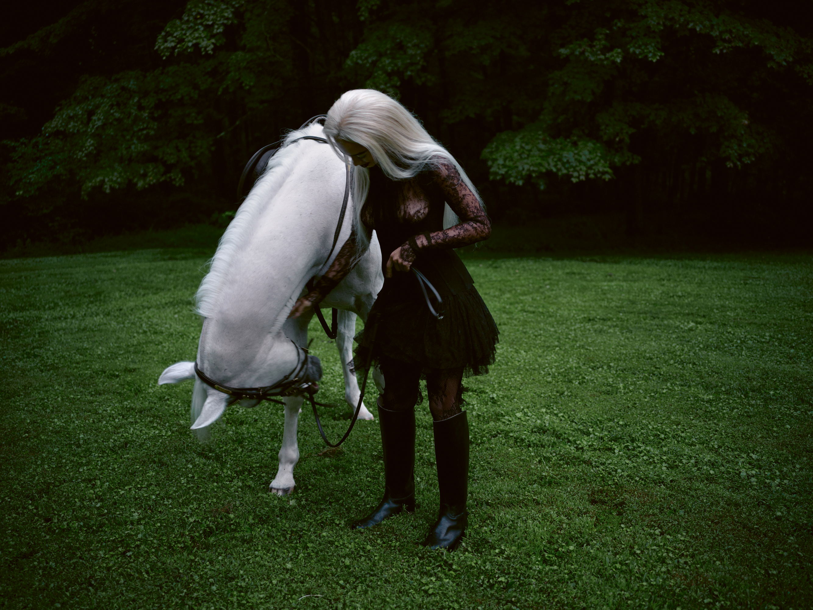 Lu wears a dress by Alexander McQueen, tights by Alexander McQueen, and boots by The Dehner Boot Company